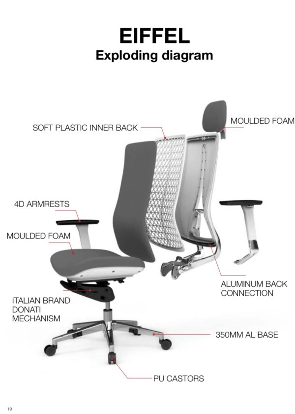 The EIFFEL ergonomic office chair is a masterpiece of precision engineering and innovative design, built to provide unparalleled comfort and support for modern work environments. Inspired by structural integrity and ergonomic science, this chair seamlessly integrates premium materials and advanced technology to redefine workplace seating.