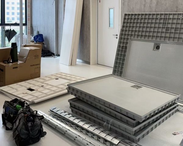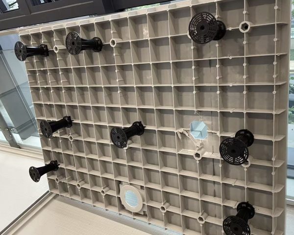 These modular components, made of durable plastic, are stacked and ready for assembly, highlighting the efficiency of this prefabricated design.