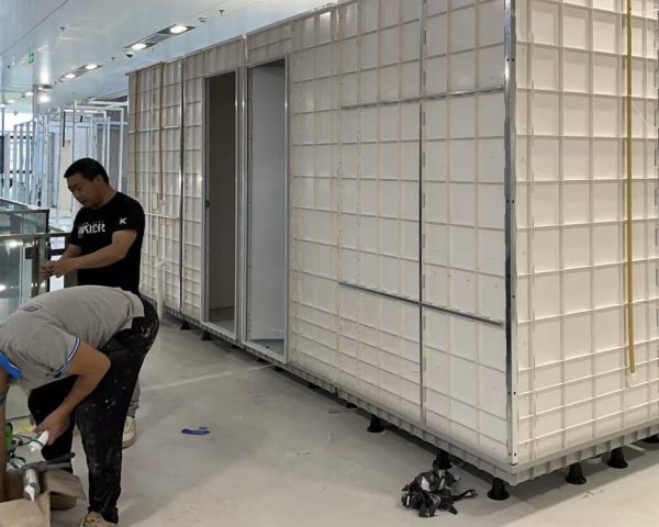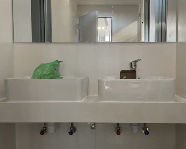 The installation site reveals a partially assembled bathroom with a double sink already in place, indicating progress in the setup. Tools, pipes, and other materials scattered around suggest active construction, while the modular unit’s exterior panels are being aligned and secured. This process demonstrates how these all-in-one bathrooms are quickly integrated into buildings, offering a practical solution for small spaces.
